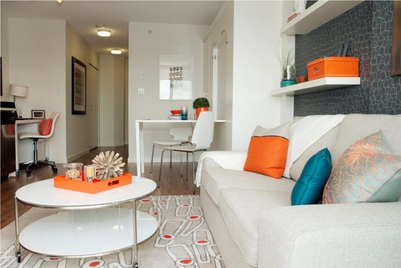 My style idea for the suite involved an overall neutral palette of white and grey with trendy shades of turquoise and orange as accent colours. The geometric pattern wallpaper in a darker grey colour helps to define the living area and is a great backdrop for the neutral coloured apartment sized sofa from IKEA. I’m proud to say this small space was furnished and styled within the real estate developer’s budget, which was under $12,000.