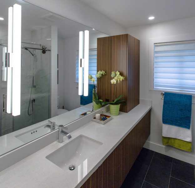 My husband had the idea to have the wall-to-wall custom floating cabinets and I loved the idea. I chose a walnut laminate for the cabinets. I love the mid-tone colour of walnut and I find it adds warmth to the space. The doors and drawers are touch-to-open for a clean, minimalist look. The upper cabinet offers additional storage for toiletries.