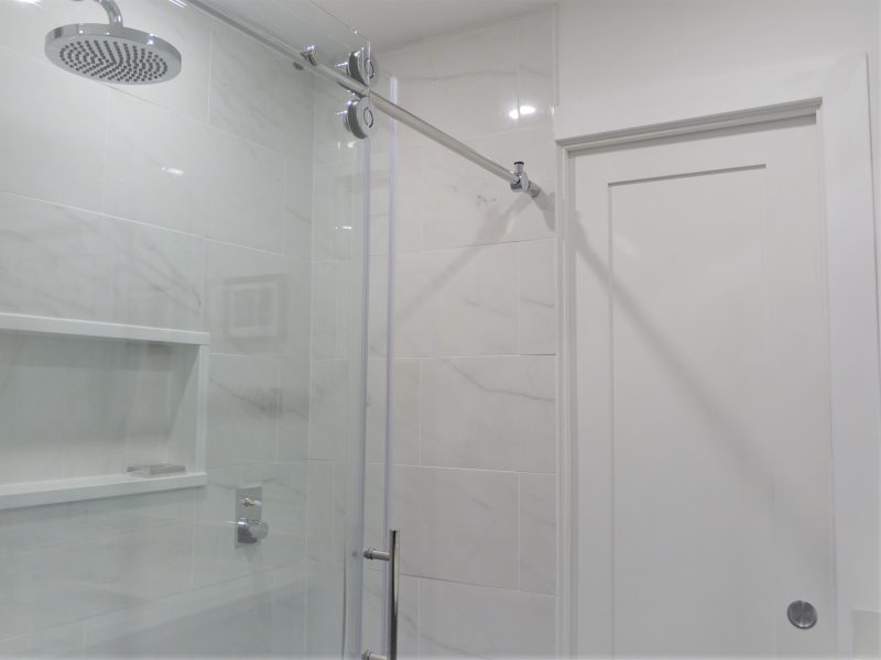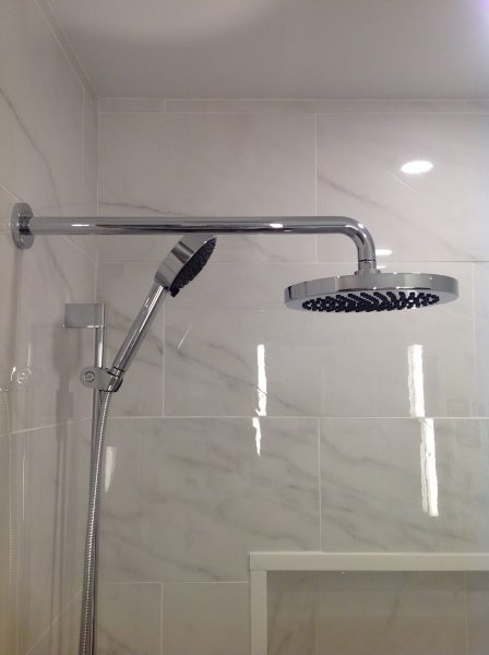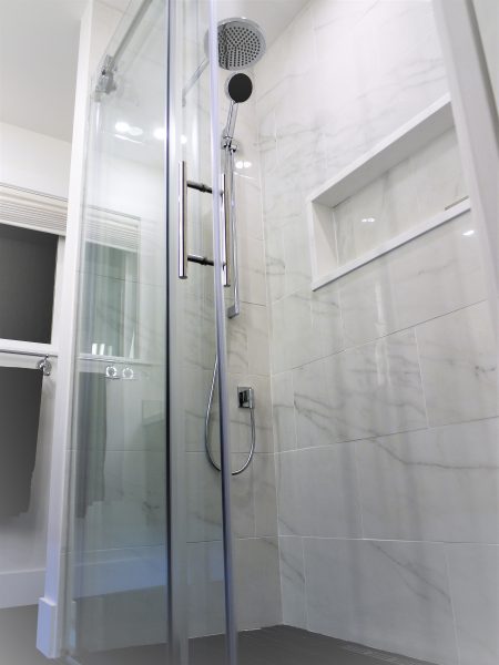 The shower controls are conveniently positioned by the shower entry for ease of use. It does not have to be right under the rain shower. A hand-held showerhead is perfect for cleaning the shower and for when you just want to wash off your feet. The slightly sloping floor in the shower directs the water flow to the trough drain located along the side wall. We chose a sliding glass shower door from RONA since it is a narrow bathroom and every bit of room counts.