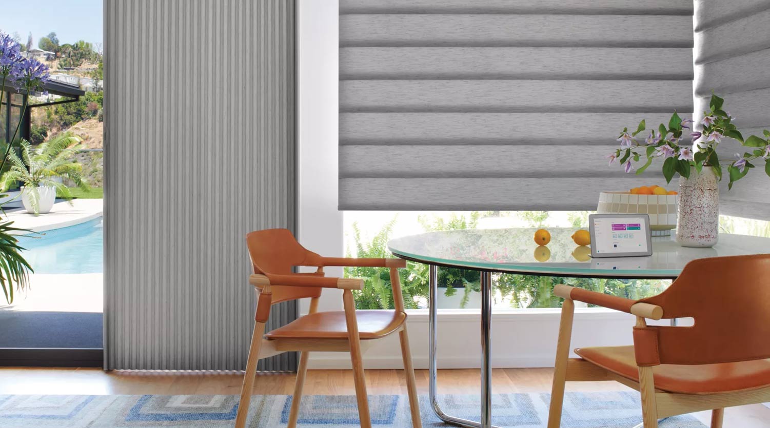 Smart home window treatments, such as those equipped with Hunter Douglas PowerView® Automation, allow you to control the amount of natural light entering your home throughout the day. By scheduling your motorized blinds to open during daylight hours, you can reduce the need for artificial lighting, thereby saving energy. During the summer months, automated window coverings can be programmed to close during peak sunlight hours, keeping your home cooler and minimizing air conditioning usage.